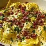 If you’re looking for a delicious, comforting dish that captures the flavors of your favorite restaurant, this Easy Olive Garden-Inspired Ravioli Carbonara is the perfect choice. With its creamy sauce, crispy bacon, and tender cheese ravioli, this meal combines simplicity and indulgence in every bite. It’s an excellent option for a busy weeknight dinner or a cozy weekend meal. Plus, it takes not much time to prepare, allowing you to enjoy a restaurant-quality experience right at home.