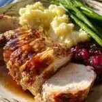 Brining the turkey overnight adds moisture and flavor. Also, don’t forget to let it rest before carving to keep the juices in.