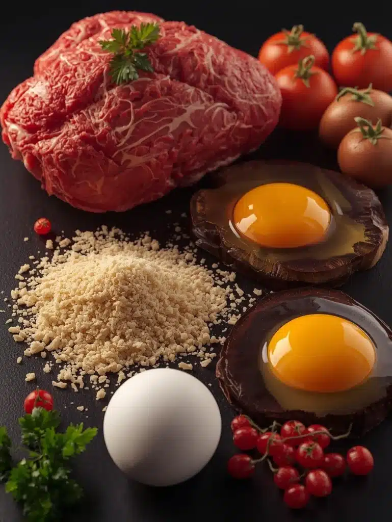 - In a large bowl, combine the ground beef, breadcrumbs, and lightly beaten eggs.